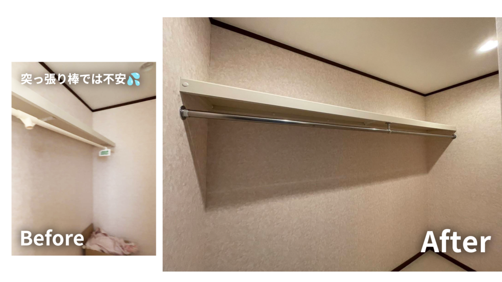 1本のみのシンプルな設置はもちろん、可動棚と組み合わせた収納工事や、ウォークインクローゼットの容量を2倍にする施工などどんな工事も対応可能です!日常の使いやすさを考えたプロの施工なら、収納力も満足度も格段にアップします。