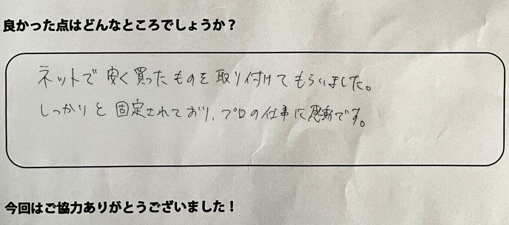 ネットで安く買ったものを取り付けてもらいました。しっかりと固定されていて、プロの仕事に感動です。