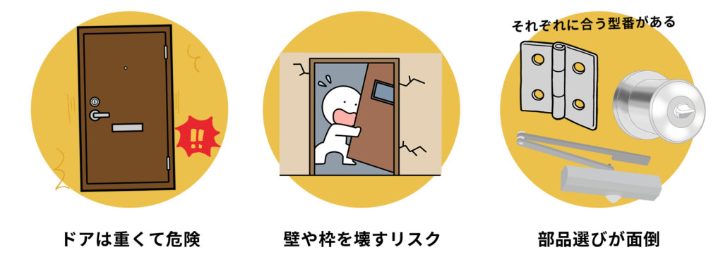 またドアは想像以上に重くて危険で、外したり支えたりする作業中に指を挟んだり、倒れてケガをするリスクがあります。さらに無理にネジを締め直すと壁や枠を傷めてしまうことも。丁番・ラッチ・ドアノブなどは規格も多く、部品選びが面倒で「買ったけど合わない…」と二度手間になるケースも少なくありません。