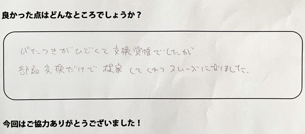 ガタつきがひどくて交換覚悟でしたが、部品交換だけで提案してくれてスムーズになりました。