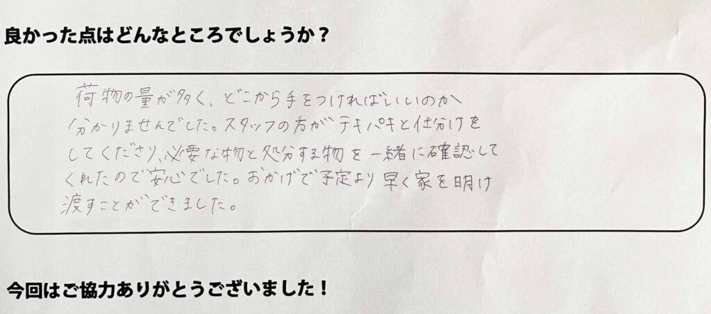 荷物の量が多く、どこから手を付ければいいのか分かりませんでした。スタッフの方がテキパキと仕分けをしてくださり、必要なものと処分するものを一緒に確認してくれたので安心でした。おかげで予定より早く家を明け渡すことができました。