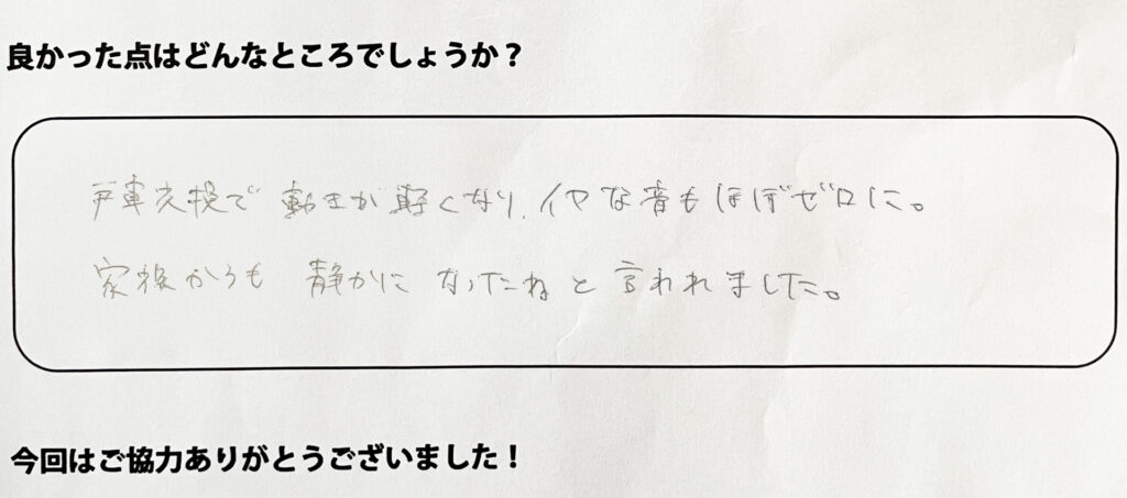 戸車交換で動きが軽くなり、イヤな音もほぼゼロに。家族から「静かになったね」と言われました。